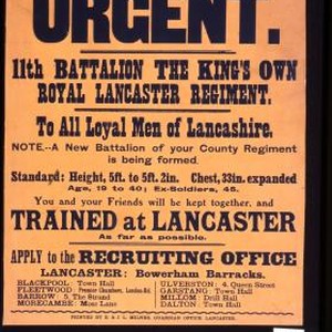 Urgent. 11th Battalion the King's Own Royal Lancaster Regiment. To all loyal men of Lancashire ... You and your friends will be kept together and trained at Lancaster as far as possible. Apply to the recruiting office