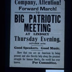 Company, attention! Forward march! To big patriotic meeting at Linsey ... Good speakers. Good music. Show that you are an American by being present and also thereby help along the greatest struggle for human liberty, the world has ever known. Per Committee