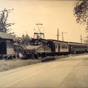 Photo--black and white: P&SR train at the Bassett Station (close to Fredericks Road) south of Sebastopol. This was the final run of the passenger car on the P&SR on April 6, 1941. Engine 506 is pulling four passenger cars with many people hanging out the windows of the cars and a line of autos on the road next to the train.