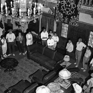 Negative shows a group of students in a sitting room in Scotty's Castle. Built between 1922 and 1931, Scotty's Castle, or Death Valley Ranch, is a "two-story Mission Revival and Spanish Colonial Revival style villa located in the Grapevine Mountains of northern Death Valley in Death Valley National Park." From: "Scotty's Castle - Wikipedia, the free encyclopedia," http://en.wikipedia.org/wiki/Scotty%27s_Castle (accessed 4/24/12). "Walter Scott, Death Valley Scotty, convinced everyone that he had built the castle with money from his rich secret mines in the area. Albert Mussey Johnson actually built the house as a vacation getaway for himself and his wife Bessie." From: "Scotty's Castle - Death Valley National Park," http://www.nps.gov/deva/historyculture/scottys-castle.htm (accessed 4/24/12). Scanned with Epson Perfection V700 Photo as 1200 dpi TIFF image in 8 bit grayscale.