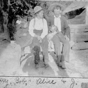 Photo--black and white: Mary (Allen) and Robert Harmon with their niece Alice Riddell and "J" the dog, about 1905. Mary and Alice's mother were sisters.