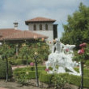Manicured garden with a marble statue in the foreground, and the Hearst Castle guest house in the background.