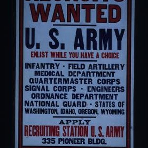 Recruits wanted. U.S. Army. Enlist while you have a choice. Infantry, field artillery, medical department, quartermaster corps, signal corps