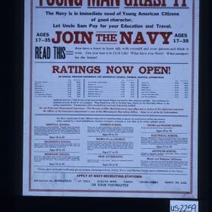 Your opportunity has arrived. Young man, grasp it. The Navy is in immediate need of young American citizens of good character ... Apply at Navy recruiting stations