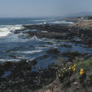 Waves roll into the tide pools and homes sit atop the cliffs, overlooking the ocean at Cambria.