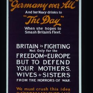 Germany's battle cry is "Germany over all" and her Navy drinks to "the day" when she hopes to smash Britain's fleet. Britain is fighting not only for the freedom of Europe but to defend your mothers, wives and sisters from the horrors of war. We must crush this idea of "Germany over all."