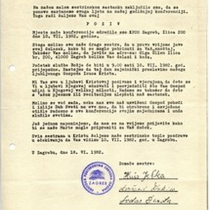 An invitation to a Pentecostal women's conference in Zagreb on July 10, 1982. [Description English/roman)] Poziv na konferenciju pentekostalnih žena u Zagrebu, 10. srpnja 1982. godine. [Description (original non-English/roman language/script)]