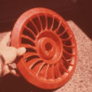 Hand is holding red metal machine part.