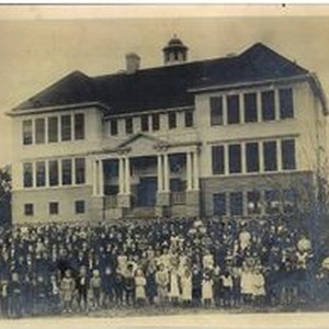 Photo--Sepia: Sebastopol Grammar School (second building) with assembled teachers and student body in front of the school sometime after 1910. The three story large building in the rear has columns and a decorated pediment. The Grammar school was located where Parkside School is now on Bodega Avenue.