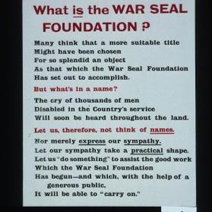 Everybody is asking, what is the War Seal Foundation? Many think that a more suitable title might have been chosen for so splendid an object as that which the War Seal Foundation has set out to accomplish. But what's in a name? The cry of thousands of men disabled in the country's service will soon be heard throughout. Let us, therefore, not think of names. Nor merely express our sympathy. Let our sympathy take a practical shape
