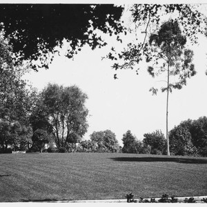 A view of the flat, tree-lined site on the San Marino ranch where the Huntington mausoleum was later erected. Constructed with white marble, the mausoleum, which is the burial place of Henry E. Huntington and his second wife Arabella Huntington, was completed in 1929, two years after Mr. Huntington's death.