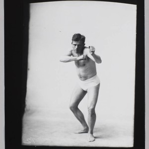 A full-length standing studio portrait of Jack London wearing only underwear. He is facing the camera in a fighting stance, with his hands balled into fists in front of him. Title devised by cataloger, date based on another print that is in JLP 456 Alb. 18 (p. 21).