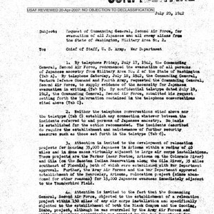 J. L. DeWitt memo regarding request of commanding general, Second Air Force, for evacuation of all Japanese and all enemy aliens from the State of Washington..., with attachments