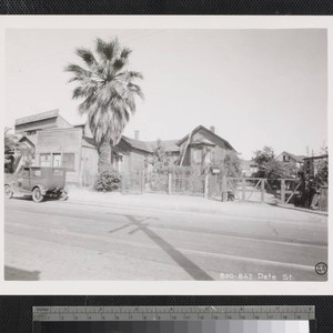 View of houses, fenced-in yard, trees, an automobile, and a palm tree on Date Street near Old Chinatown in Los Angeles, with American Foundry at the far left of the photograph. Title transcribed from photograph.