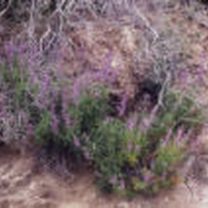 Overhead picture of green shrubs with purple flowers.