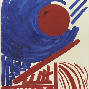 Abstract painting in blue, red, and gold agains a white background.