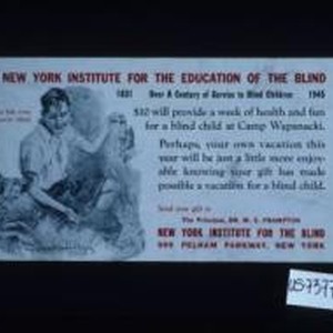 The New York Institute for the Education of the Blind, 1831 - 1945. Over a century of service to blind children. $10 will provide a week of health and fun for a blind child at Camp Wapanacki. Perhaps your own vacation this year will be just a little more enjoyable knowing your gift has made possible a vacation for a blind child