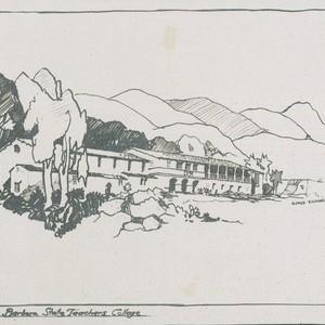 A photograph of a drawing by Alfred Eichler of the Administration Building for the Santa Barbara State Teachers College, formerly the State Normal School. The rendering shows the proposed administration building which housed offices, classrooms, a library, and a theater. Currently, the building is home to the Riviera Theater, and is part of the Santa Barbara International Film Festival.