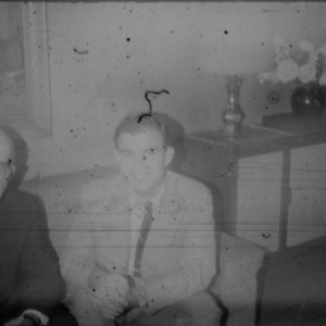 Leon Peters and unidentified man seated on a couch