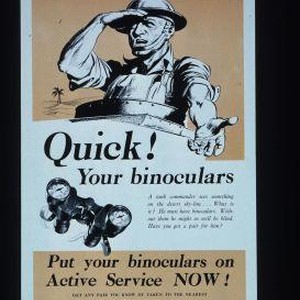Quick! Your binoculars ... Put your binoculars on active Service now! Get any pair you know of taken to the nearest optician displaying the Ministry of Supply poster