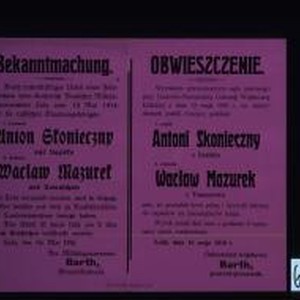 Bekanntmachung. Durch rechtskraftiges Urteil ... sind die russischen Staatsangehorigen: ... zum Tode verurteilt worden, weil sie Schusswaffen besessen ... Lodz, den 16. Mai 1916. Der Militargouverneur: Barth, Generalleutnant. ... Gubernator wojskowy: Barth, general-porucznik