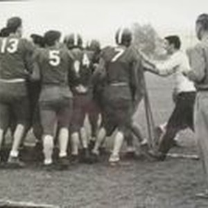 Photo--Black and white: Analy High School football team after the final game of the season, Saturday, November 5th, 1949. Analy 26--Petaluma 21. Coaches Walt Foster and Leo Whalon on the right.