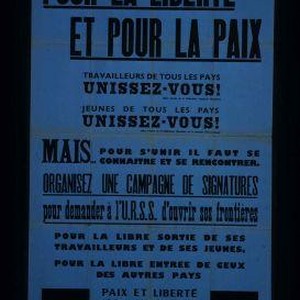 Pour la liberte et pour la paix. Travailleurs de tous les pays unissez-vous ! ... Jeunes de tous les pays unissez-vous ! Mais pour s'unir il faut se connaitre et se rencontrer. Organisez une campagne de signatures pour demander a l'U.R.S.S. d'ouvrir ses frontieres pour la libre sortie de ses travailleurs et de ses jeunes, pour la libre entree de ceux des autres pays