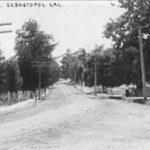 Postcard--photo--black and white: Bodega Avenue, Sebastopol about 1900s. Sidewalks on both sides of dirt road with telephone/electric poles. House on left. Thought to be, by Harold Pellini and Jack Fore, present location of Parkside School on right and fire department on left, looking south.