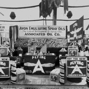 Photo--black and white: Gravenstein Apple Show display the "Avon Emulsifine Spray Oils from Associated Oil Co." Spray oils are used to spray apple orchards for insects. Jackie Boy brand and Blue Anchor brand apple boxes are seen in the display. H. B. Scudder Real Estate and Insurance sign seen to the left and vintage cars to the right. Circa 1930s