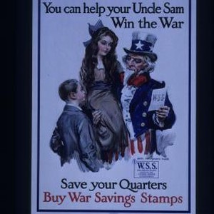Boys and girls! You can help your Uncle Sam win the war. Save your quarters. Buy War Savings Stamps