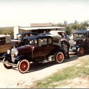 Vintage cars visit the Hallberg Apple Farm roadside stand, October, 1982