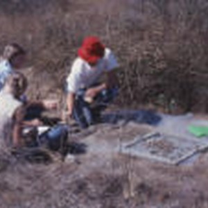 Three students from Lab III sifting and sorting soil samples at Bernard Field Station.