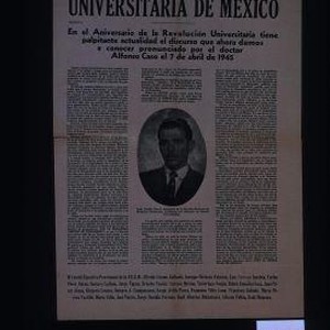 En el aniversario de la Revolucion Universitaria ... el discurso pronunciado por el doctor Alfonso Caso el 7 de abril de 1945. ... Todos nosotros debemos sentir este fervor por la libertad de pensamiento, POR LA VERDADERA LIBERTAD DE PENSAMIENTO ... Mexico ha sido un pais de revolucion ... Poco a poco la luz fue entrando en las mentes logrando la liberacion politica; mas tarde la liberacion espiritual; quizas mas tarde lograremos la liberacion economica