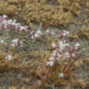 Multiple white flowers and pink buds growing in soil among dry grass at Christy Ranch on Santa Cruz Island.