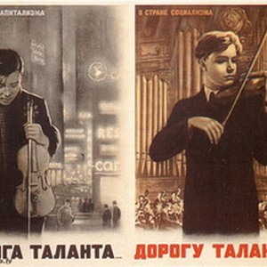 Soviet propagandistic poster-diptych. Captions read, Left: "В странах капитализма: Дорога таланта... / V stranakh kapitalizma: Doroga talanta", meaning, "In the countries of capitalism: The way of the talented" Right: "В странах социализма: Дорогу талантам! / V stranakh sotsializma: Dorogu talantam!", meaning, "In the countries of socialism: Make a way for the talented!". [Description English/roman)]