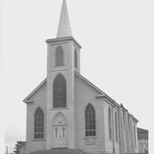 Photo--black and white: St Teresa's Catholic Church in Bodega (restored circa 1950-60's). One of the oldest church bldg in Sonoma County. Side view showing gothic windows on side and church steeple on left. Rev. Louis Rossi was first pastor for the churches at Tomales and Bodega appointed in 1860.