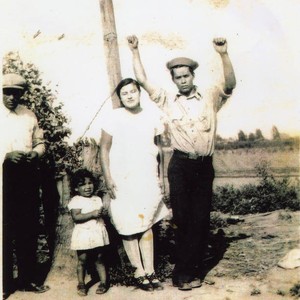 Standing under a clothesline in the Molina family backyard on Bonnie Beach Place are Sailor Pete (far left), toddler Mary Molina with mother Celia Cantu Molina (center), and an unidentified young adult (right). Image is from a photocopy.