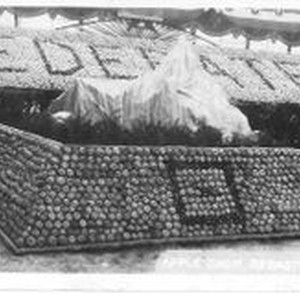 Postcard--black and white: 1915 Gravenstein Apple Show exhibit with "Federated" spelled out in apples behind another display of apples.
