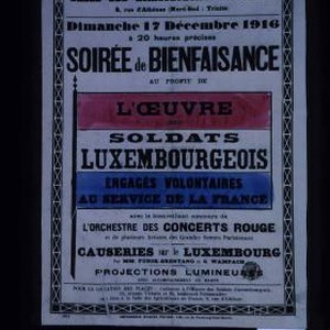Salle des agriculteurs de France ... Dimanche, 17 decembre 1916 ... : Soiree de bienfaisance au profit de l'oeuvre des soldats luxembourgeois engages volontaires au service de la France, avec ... l'Orchestre des concerts rouge et de plusieurs artistes des grandes scenes parisiennes, causeries sur le Luxembourg