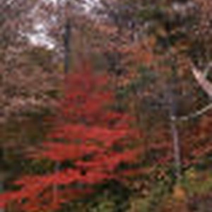 Tree with scarlet leaves surrounded by trees with leaves of various colors.
