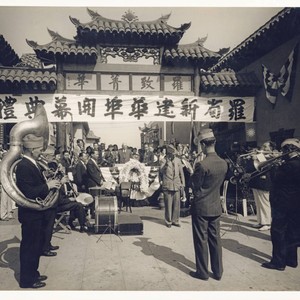 Band members playing instruments at an opening ceremony for the New Chinatown in Los Angeles. In the background are onlookers. The Old Chinatown in Los Angeles was demolished in 1933 to make way for Union Station. The New Chinatown in Los Angeles was completed in 1938 and was the first planned Chinatown in North America. Hong family papers. The Huntington Library, San Marino, CA.