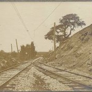 Photo--black and white: Petaluma & Santa Rosa electric tracks north from the Quarry, 1904. (Stoney Point Quarry)