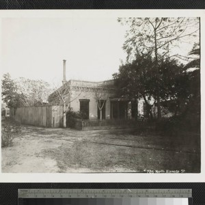 View of a building made of brick with four large windows and a covered entrance on North Alameda Street, Los Angeles. There is a fence surrounding the building. Train tracks run alongside the fence and a variety of trees are both outside and inside the fence. Title transcribed from photograph.