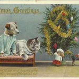 Postcard--color print: Christmas message. Christmas tree with dog and cat dressed in nightgowns. Doll and horse toys. Handwritten message on back.