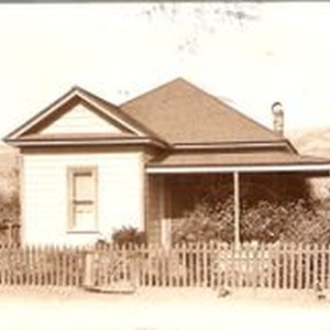 Postcard, black and white, photo: West County house--1912. White wood frame house with picket fence. Hills in background. Handwritten note on back to Mary Guisler in Graton, postmarked 1912 from Geyserville.