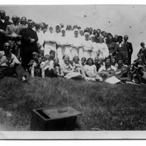 Photograph of church members with the ones to be baptized, gathered on the meadow in Novi Sad during 1940's. [Description English/roman)] Članovi crkve zajedno s krštenicima, okupljeni na livadi u Novom Sadu tijekom 1940-ih. [Description (original non-English/roman language/script)]