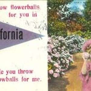 Postcard--color print: Greeting card. California theme postcard. Girl holding hydranga 'snoball'. Handwritten message on back. Postmarked Graton Nov 28, 1913.
