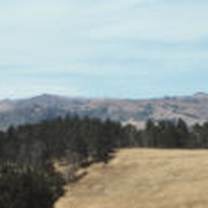 Tall dark green trees stand out against the dry brown grass on the hill.