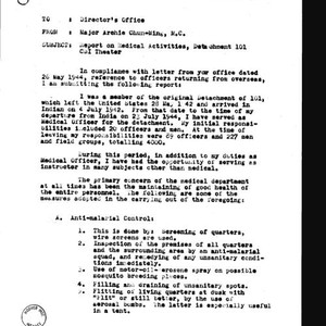 Archie Chun-Ming memo (part) to director's office regarding report on medical activities, detachment 101, CBI theater