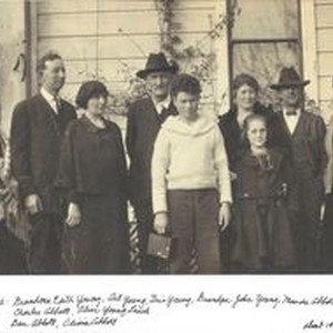 Abbott family L-R: Grandma Edith Young, Art Young, Iris Young, Grandpa John Young, Maude Abbott, Charles Abbott, Alice Young Leach, Front: Ben Abbott, Olivia Abbott. c. 1918. WINKLER, DUER, ABBOTT FAMILY